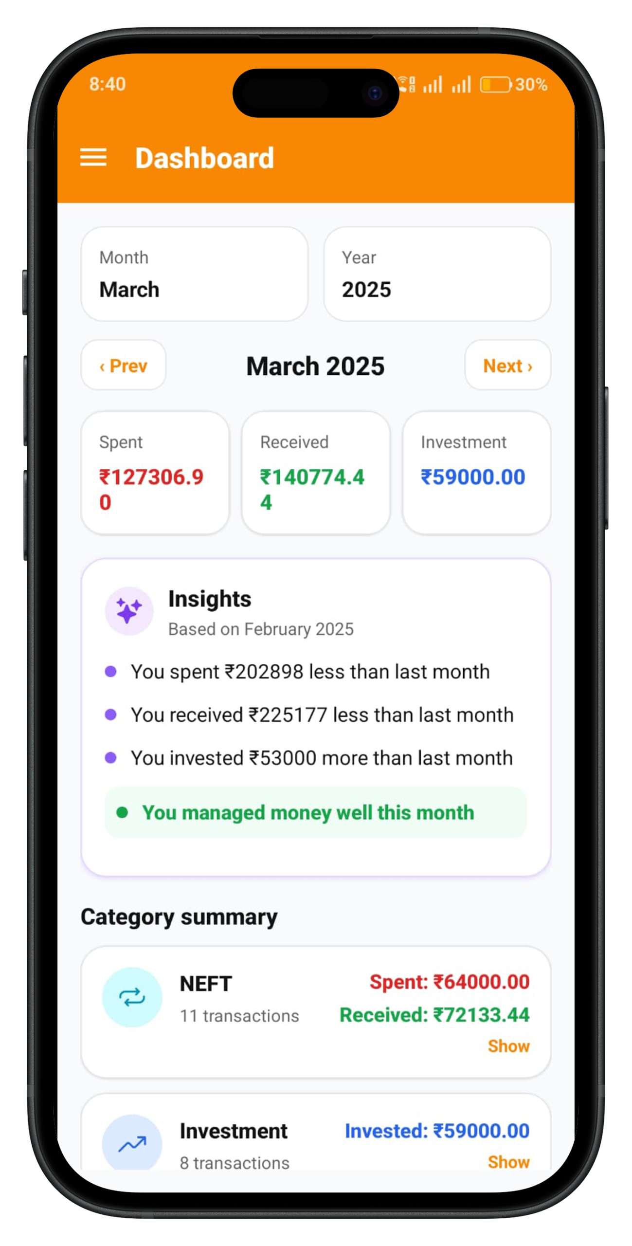 • Auto-categorizes transactions (Food, Shopping, Bills, etc.)