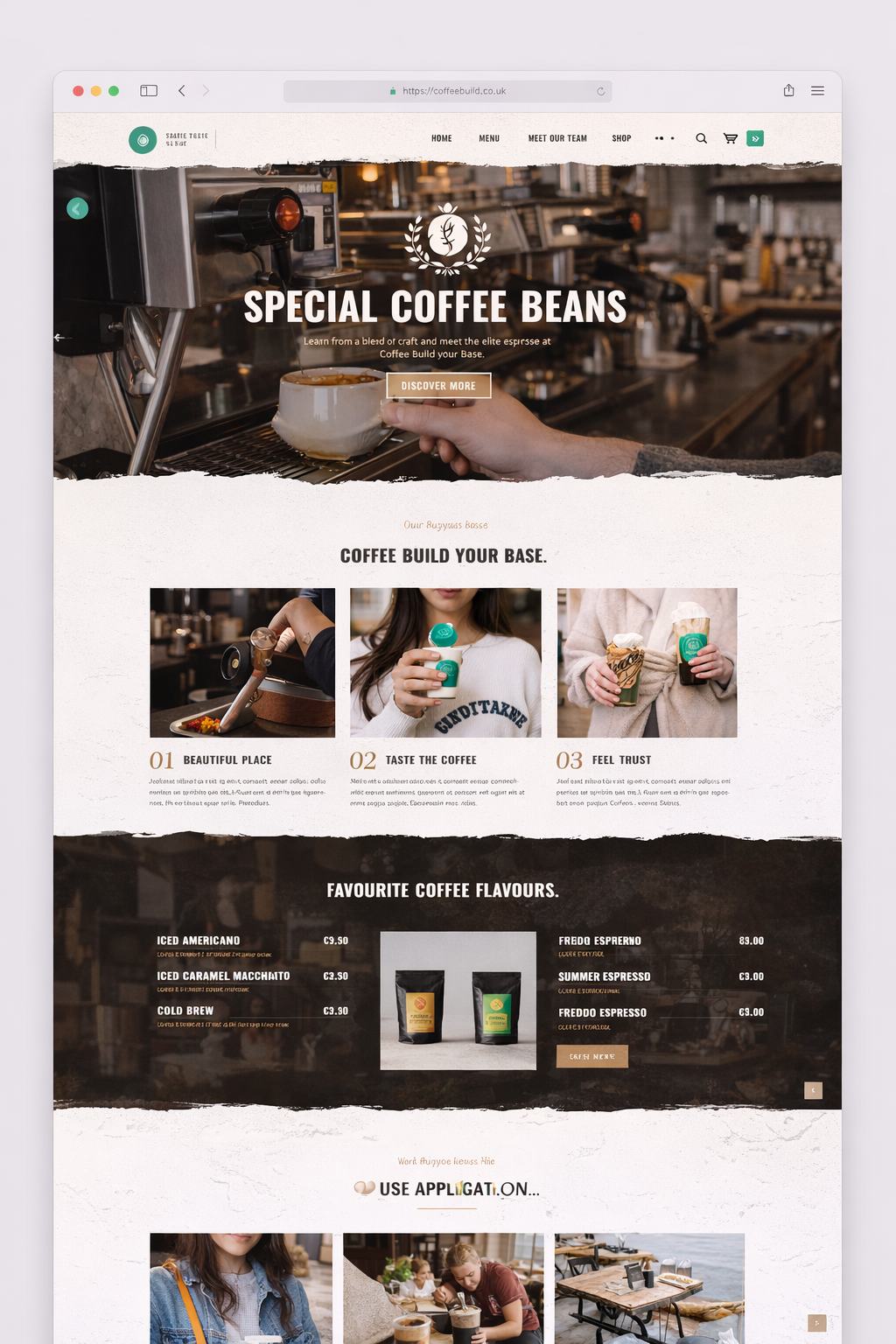Custom website design tailored to the coffee shop brand, Menu and offerings presentation with clean, easy navigation, Mobile-friendly and responsive layout for on-the-go users.